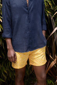 This swim short is crafted from exceptionally soft, lightweight fabric that feels effortless all day long. The elasticated waistband offers a secure, comfortable fit, while two side pockets and a zippered back pocket provide practical storage. Accented with understated geometric patterns, they strike a balance between structure and ease — ideal for warm days by the water or casual afternoons.