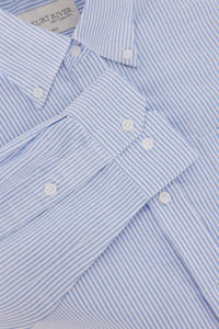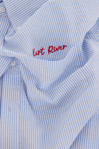 Crafted from premium 100% cotton Oxford cloth, this blue striped shirt blends classic style with a modern twist. It features a button-down collar, a chest pocket for a sporty edge, and a relaxed yet refined fit. The defining detail: the Kurt River signature embroidery partially revealed at the top of the front pocket—half visible, half tucked inside—adding a subtle yet distinctive touch